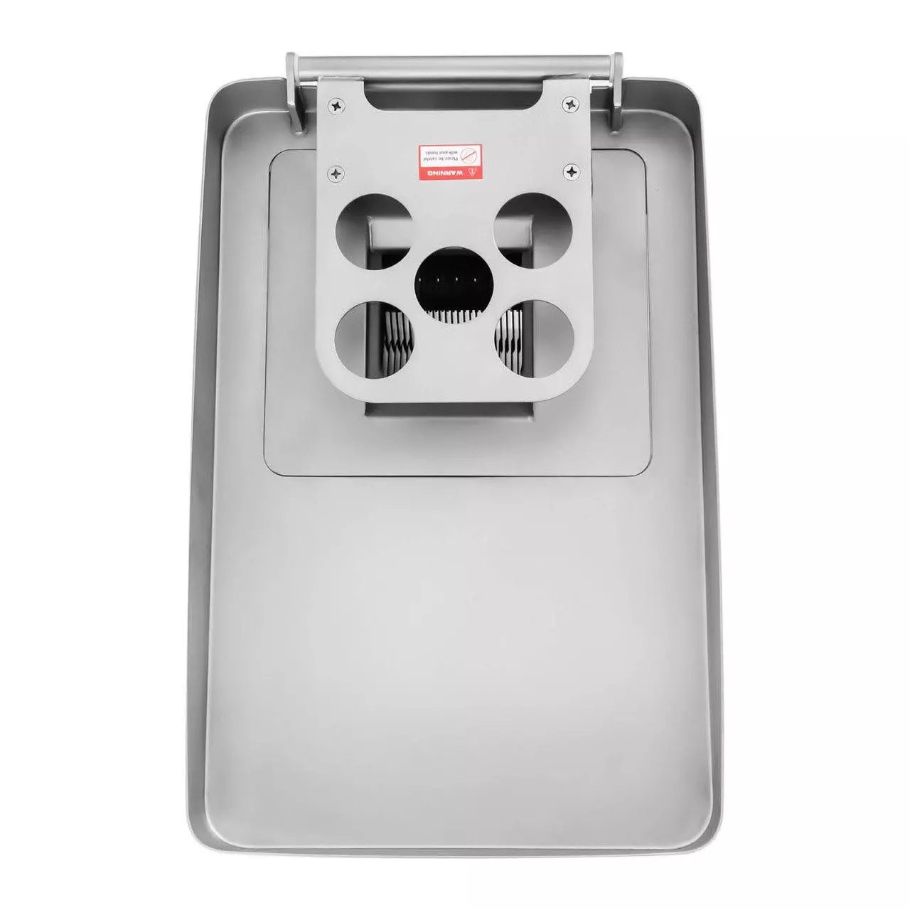 Die Konstruktion der Schneidemaschine Fleischstreifen ist einfach wie effektiv. Das Geh„use aus langlebigem und lebensmittelechtem Edelstahl erfllt alle Hygienestandards der Gastronomie und bietet die n”tige Stabilit„t, um groáe Mengen Fleisch zu verarbeiten. Eine groáe Ablagefl„che fr die zu schneidenden Lebensmittel vereinfacht die Verarbeitung der Fleischstcke. Diese werden ber einer ™ffnung mit Schutzabdeckung zu den rotierenden Klingen gefhrt, die mit einer Geschwindigkeit von 96 U/min das Fleisch in das Ger„t hineinziehen und in gleichm„áige Streifen schneiden. Unter den Klingen f„llt das geschnittene Fleisch in einen Beh„lter, den Sie bereithalten mssen.