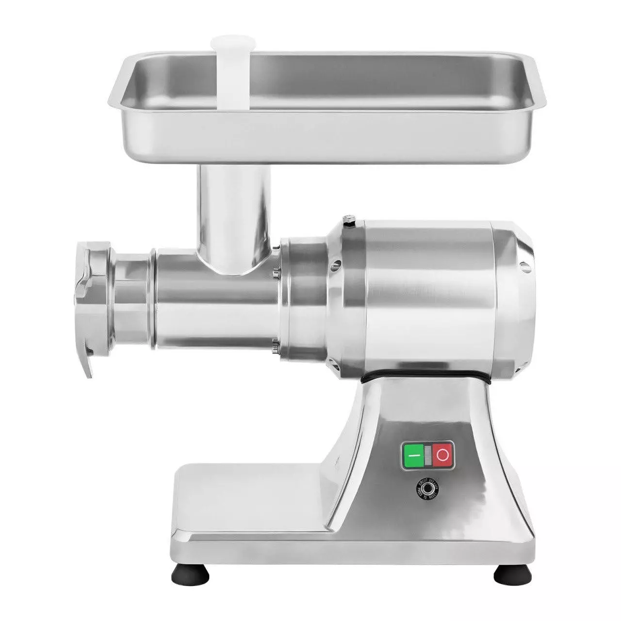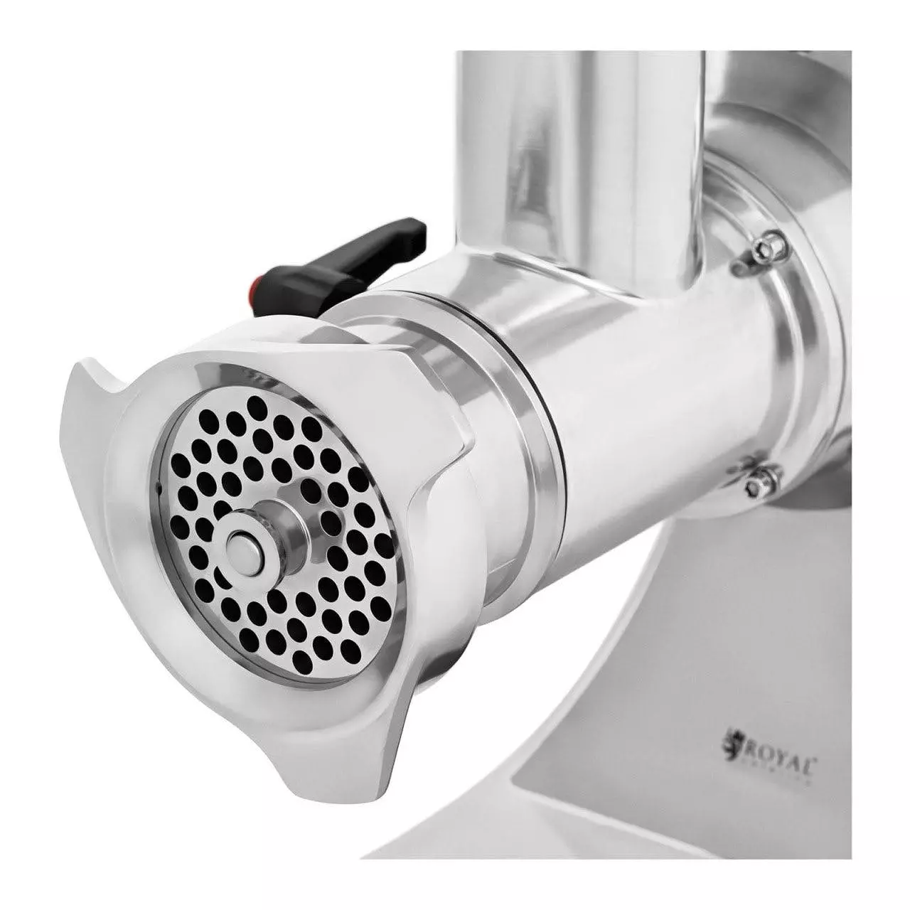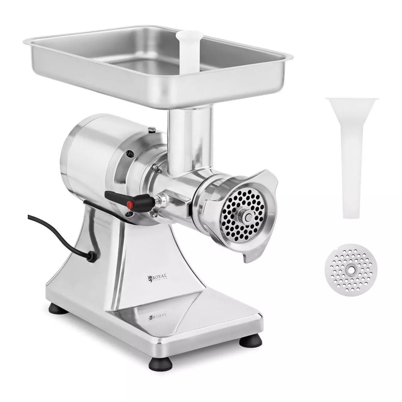 Der leistungsstarke Fleischwolf verarbeitet 220 kg/h an FleischDer Fleischwolf RCFW 321PRO aus dem Fleischereibedarf von Royal Catering ist ein effektives, leicht bedienbares Gerät für die Lebensmittelverarbeitung. Der leistungsstarke 900-W-Motor überträgt mühelos die Kraft, die Sie zum Zerkleinern selbst großer Fleischmengen benötigen. Mit einem angemessenen Energieverbrauch kann der Fleischwolf elektrisch bis zu 220 kg Lebensmittel pro Stunde verarbeiten. Die Bedienung des Geräts erfolgt einfach wie effektiv über einen Ein/Aus-Schalter. Das Gehäuse ist aus einer Aluminiumlegierung und die Bauteile aus Edelstahl (SS420) sind deutlich stabiler als diejenigen vergleichbarer Modelle. Darüber hinaus erweist sich das verwendete Material als äußerst hygienisch und ist exzellent für die Verarbeitung von Lebensmitteln geeignet. Das Zubehör eignet sich für die vielseitige Herstellung Ihrer eigenen Hamburger, Wurstwaren und sonstiger Fleischprodukte. Die große Fleischablage und der Kunststoffschieber erleichtern Ihnen das Arbeiten. Dabei liefern die Lochscheiben mit einem Durchmesser von 6 / 8 mm feine wie grob zerhackte Fleischmassen, die sich optimal weiterverarbeiten lassen.Technische DetailsSpannung: 230 VEffizienz: 220 kg/hNenndrehzahl: 150 U/minMaße Einlass: 67 mmLeistung: 900 WSchmiermittel: Ja Stromkabel: 1,6 mMaterial Gehäuse: Aluminiumlegierung Durchmesser Lochscheibe: 99 mmMaße Auslass: 99 mmMaterial Schieber Kunststoff (PP) Anzahl Lochscheiben: 2 Durchmesser Löcher in der Lochscheibe: 6 / 8 mmMaterial Messer und Lochscheiben: Edelstahl (SS420) LieferumfangFleischwolf RCFW 321PRO, 2 Lochscheiben (6, 8 mm), Fleischstopfer, Bedienungsanleitung