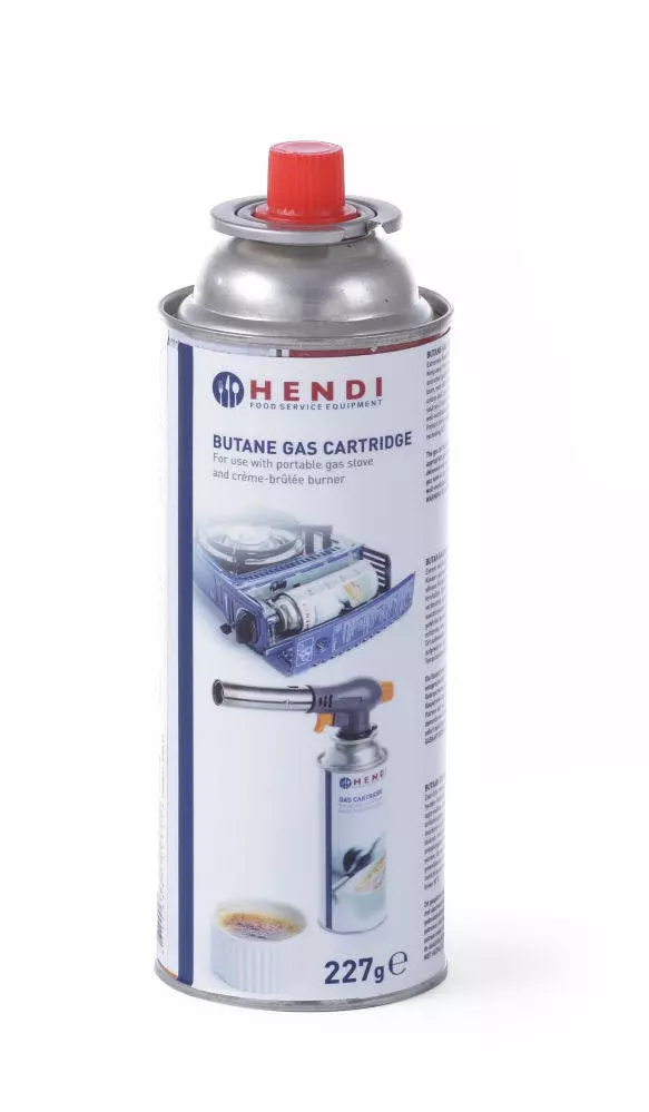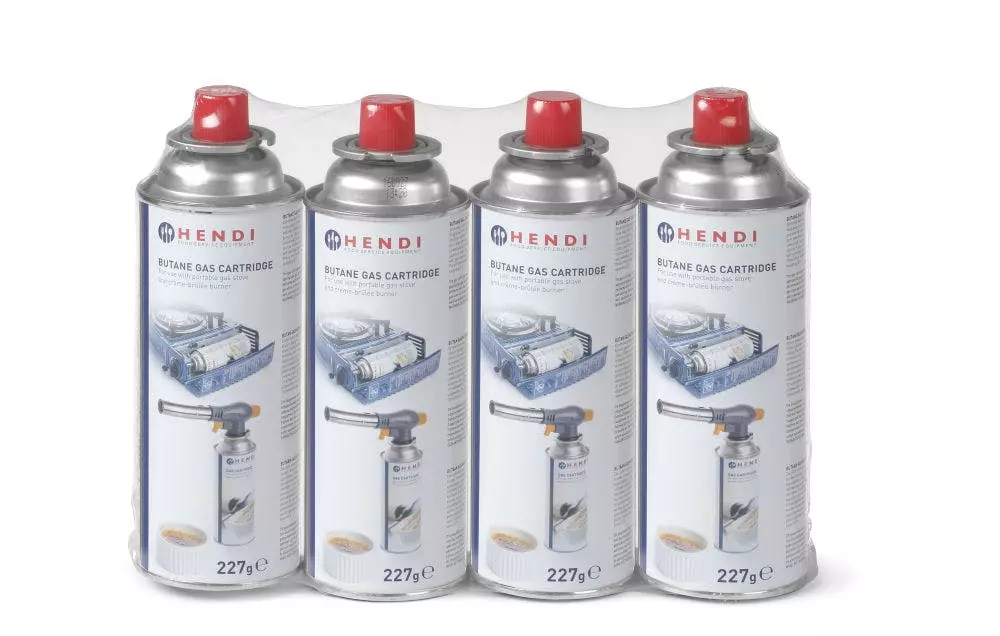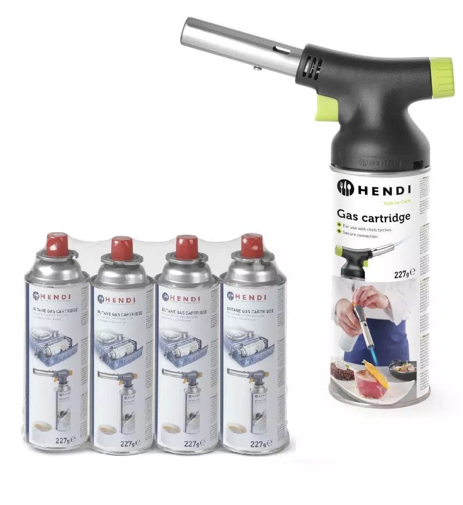 Im Set ist der Crème-Brûlée-Brenner und 4 Stück Gaskartuschen inbegriffen, beides der Marke HENDI.