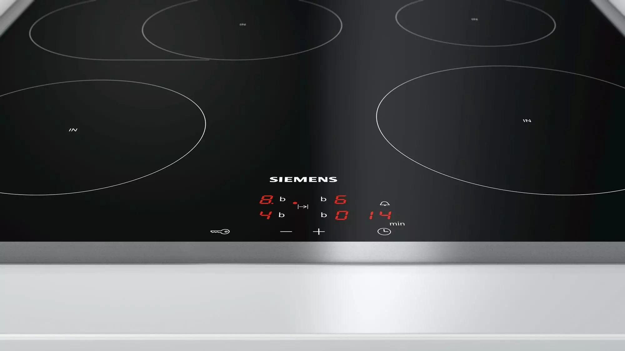 Siemens EQ521IA00. Kochfeldtyp: Zonen-Induktionskochfeld, Anzahl Herdplatten/Kochzonen: 4 Zone(n), Art der Oberfläche: Glaskeramik. Ofentyp: Elektrischer Ofen, Netto-Ofenvolumen: 71 l, Ofenfarbe: Schwarz