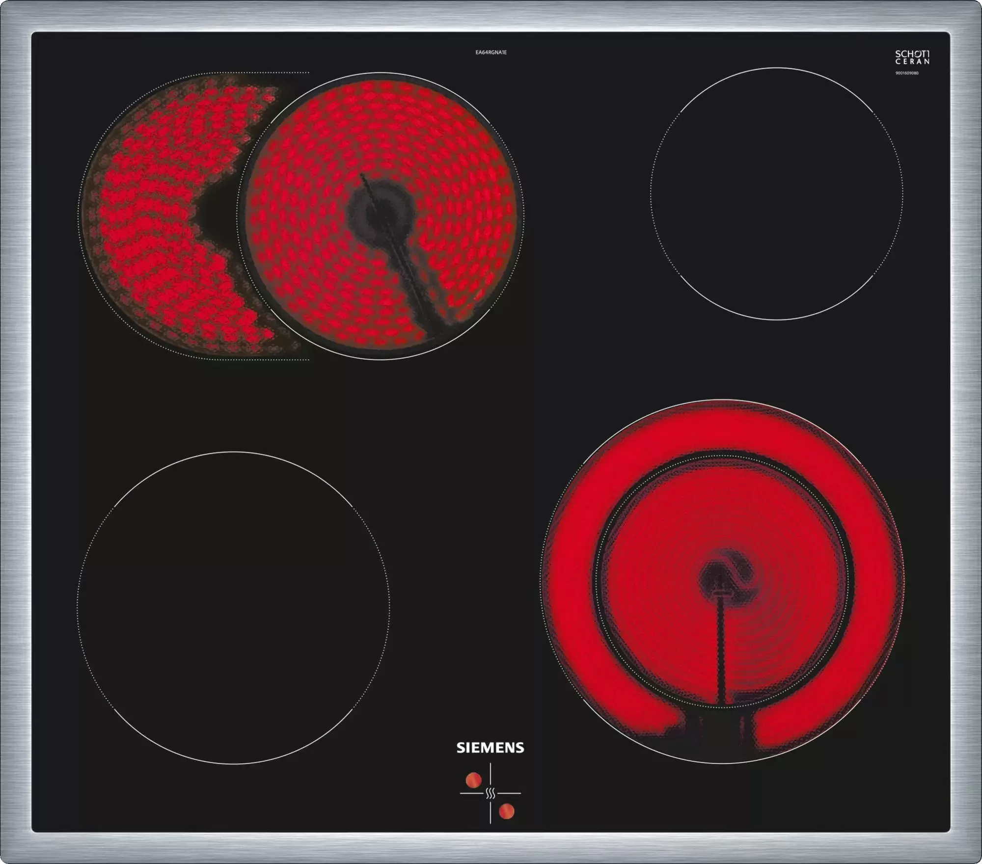Siemens HE213BBS0 + EA64RGNA1E. Kochfeldtyp: Keramik, Anzahl Herdplatten/Kochzonen: 4 Zone(n), Art der Oberfläche: Glaskeramik. Ofentyp: Elektrischer Ofen, Netto-Ofenvolumen: 71 l, Ofenfarbe: Edelstahl/Schwarz